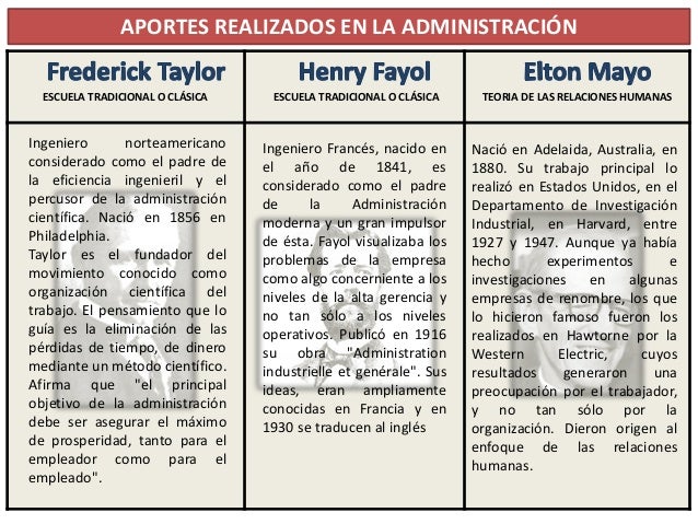 Tres grandes personajes que han marcado la administración y que han creado grandes aportaciones a la misma, son Frederick W. Taylor, Henri Fayol y Elton Mayo, cada uno de ellos ha aportado sus principios, y modelos sobre la administración.